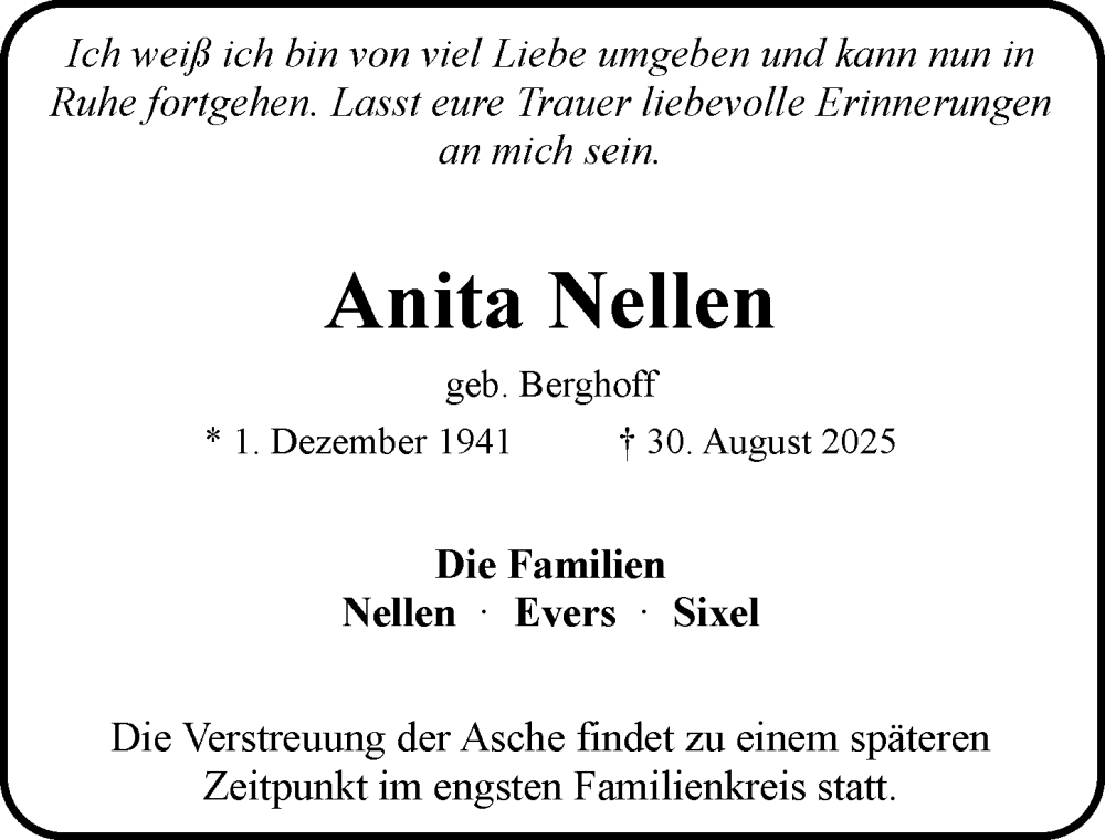 Hier finden Sie alle Traueranzeigen aus der Zeitung, die bisher für Anita Nellen erschienen sind. Weitere Traueranzeigen, die in der Zeitung erscheinen, werden hier ebenfalls aufgelistet