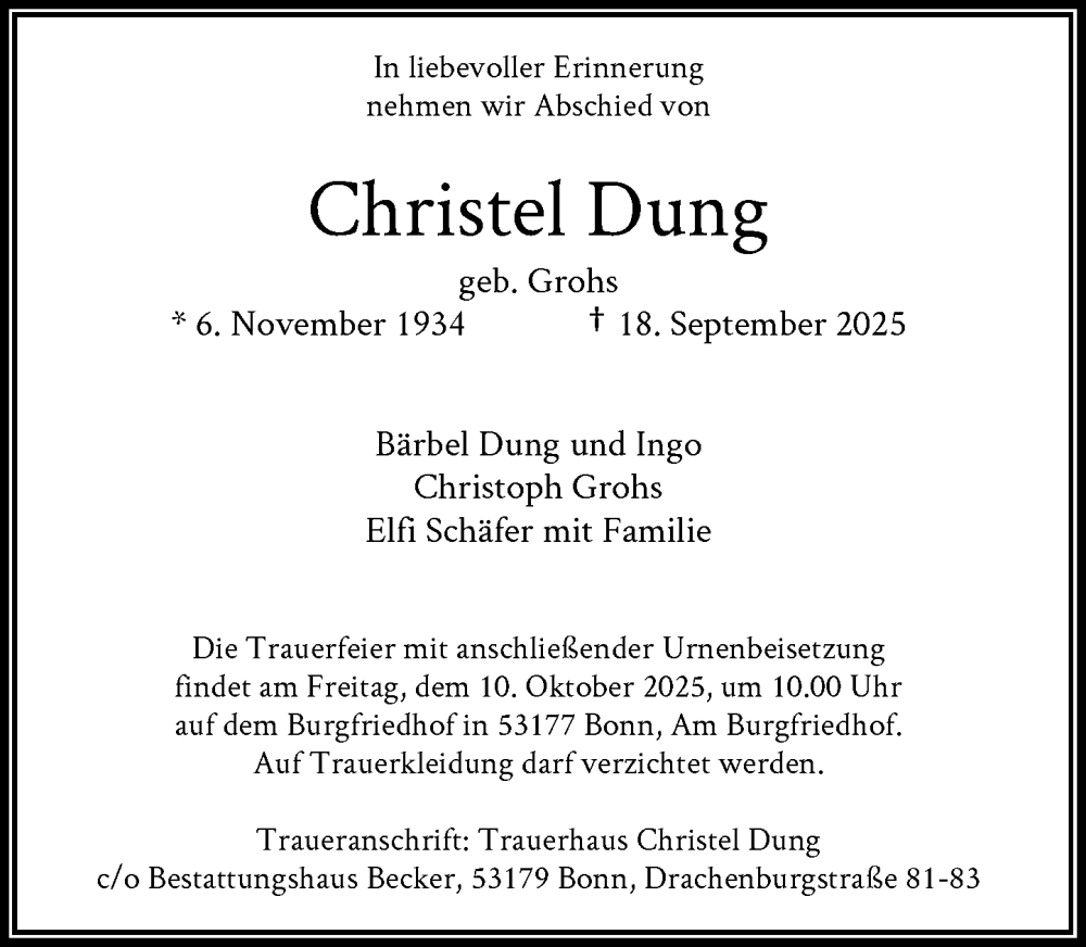 Hier finden Sie alle Traueranzeigen aus der Zeitung, die bisher für Christel Dung erschienen sind. Weitere Traueranzeigen, die in der Zeitung erscheinen, werden hier ebenfalls aufgelistet