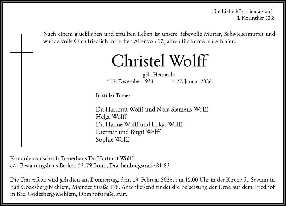 Hier finden Sie alle Traueranzeigen aus der Zeitung, die bisher für Christel Wolff erschienen sind. Weitere Traueranzeigen, die in der Zeitung erscheinen, werden hier ebenfalls aufgelistet
