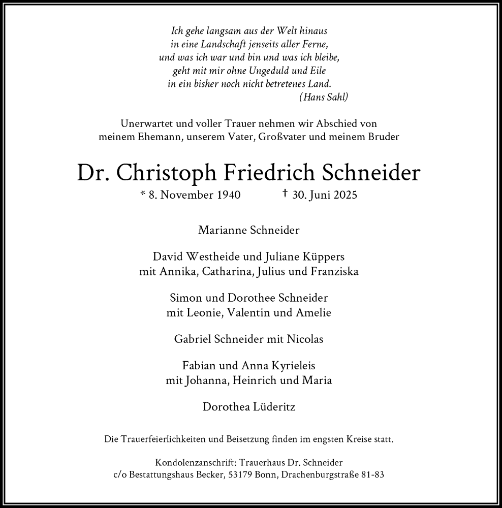 Hier finden Sie alle Traueranzeigen aus der Zeitung, die bisher für Christoph Friedrich Schneider erschienen sind. Weitere Traueranzeigen, die in der Zeitung erscheinen, werden hier ebenfalls aufgelistet
