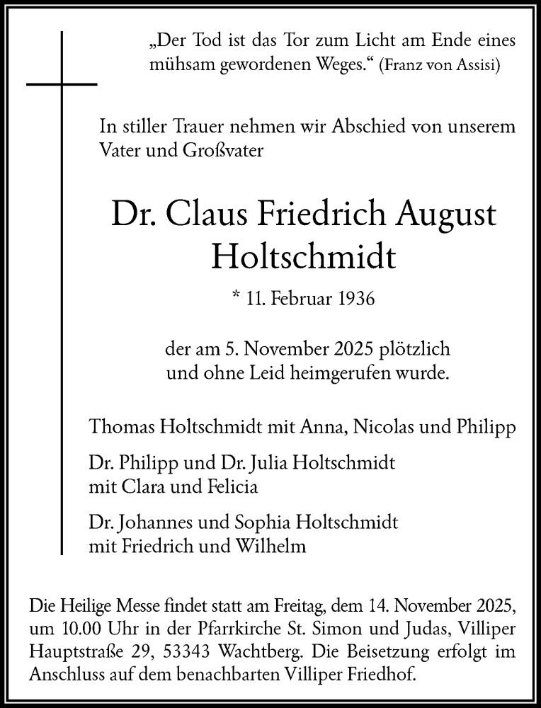 Hier finden Sie alle Traueranzeigen aus der Zeitung, die bisher für Claus Friedrich August Holtschmidt erschienen sind. Weitere Traueranzeigen, die in der Zeitung erscheinen, werden hier ebenfalls aufgelistet