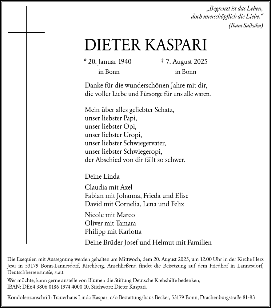 Hier finden Sie alle Traueranzeigen aus der Zeitung, die bisher für Dieter Kaspari erschienen sind. Weitere Traueranzeigen, die in der Zeitung erscheinen, werden hier ebenfalls aufgelistet