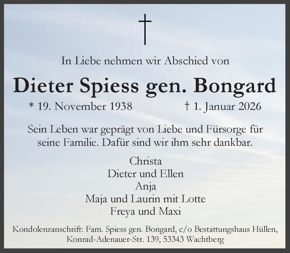 Hier finden Sie alle Traueranzeigen aus der Zeitung, die bisher für Dieter Spiess erschienen sind. Weitere Traueranzeigen, die in der Zeitung erscheinen, werden hier ebenfalls aufgelistet