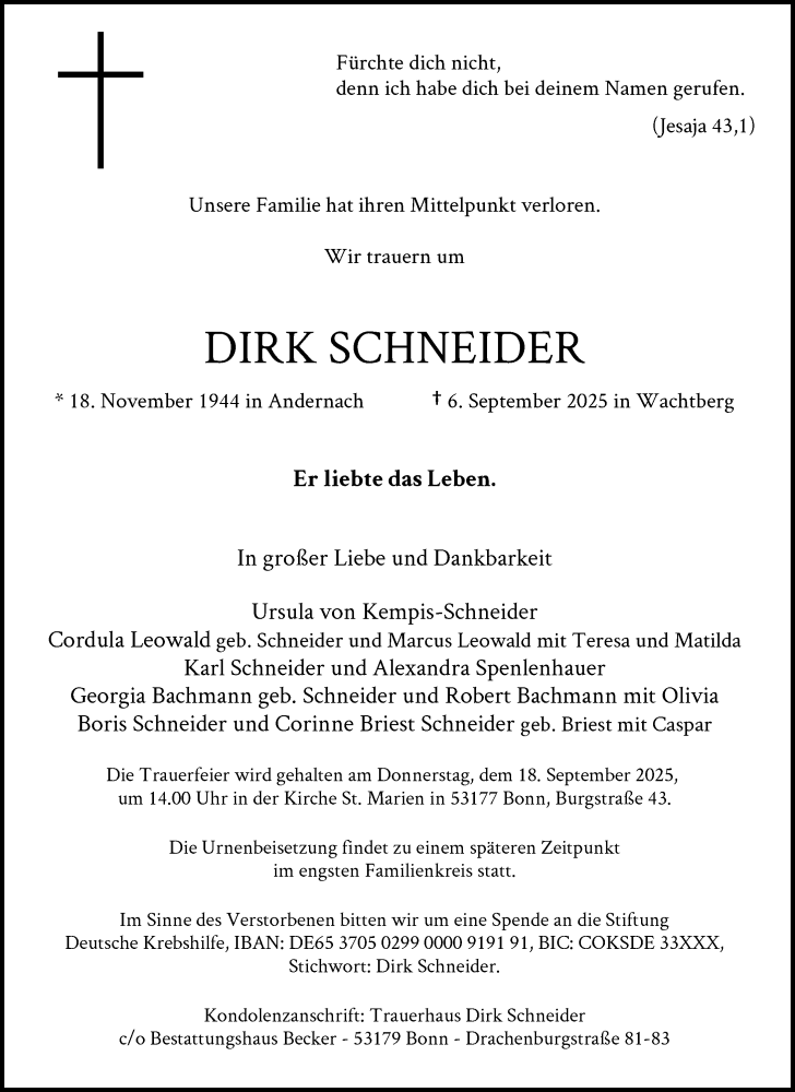 Hier finden Sie alle Traueranzeigen aus der Zeitung, die bisher für Dirk Schneider erschienen sind. Weitere Traueranzeigen, die in der Zeitung erscheinen, werden hier ebenfalls aufgelistet