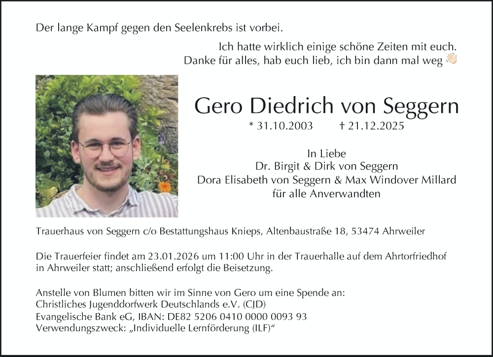 Hier finden Sie alle Traueranzeigen aus der Zeitung, die bisher für Gero Diedrich von Seggern erschienen sind. Weitere Traueranzeigen, die in der Zeitung erscheinen, werden hier ebenfalls aufgelistet