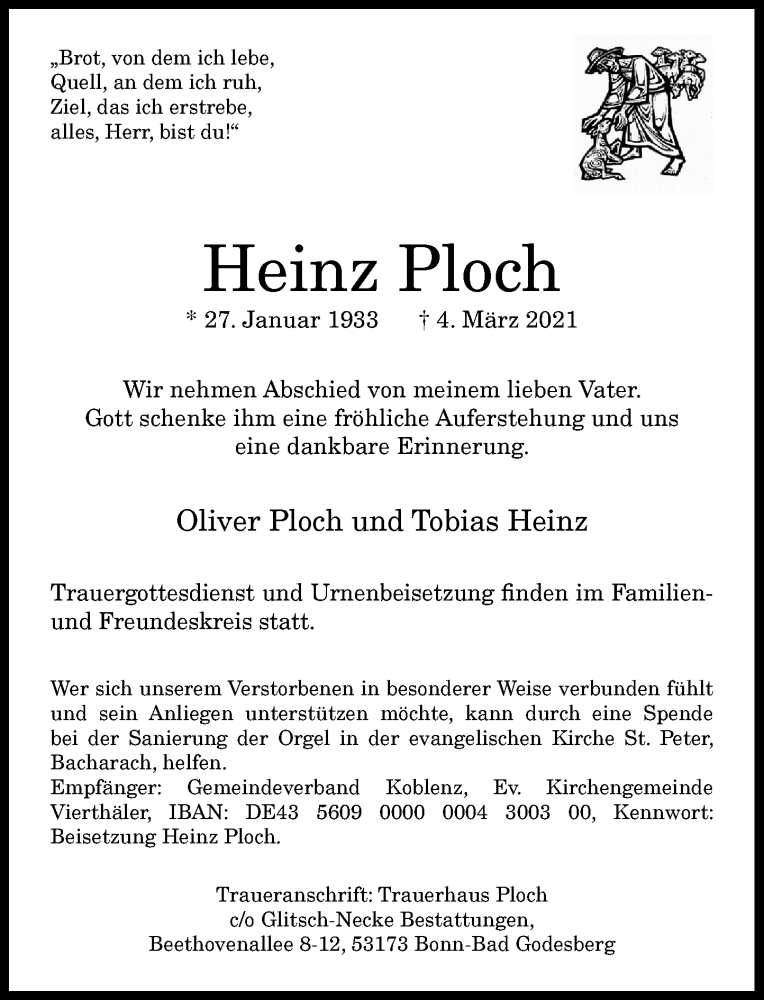 Hier finden Sie alle Traueranzeigen aus der Zeitung, die bisher für Heinz Ploch erschienen sind. Weitere Traueranzeigen, die in der Zeitung erscheinen, werden hier ebenfalls aufgelistet