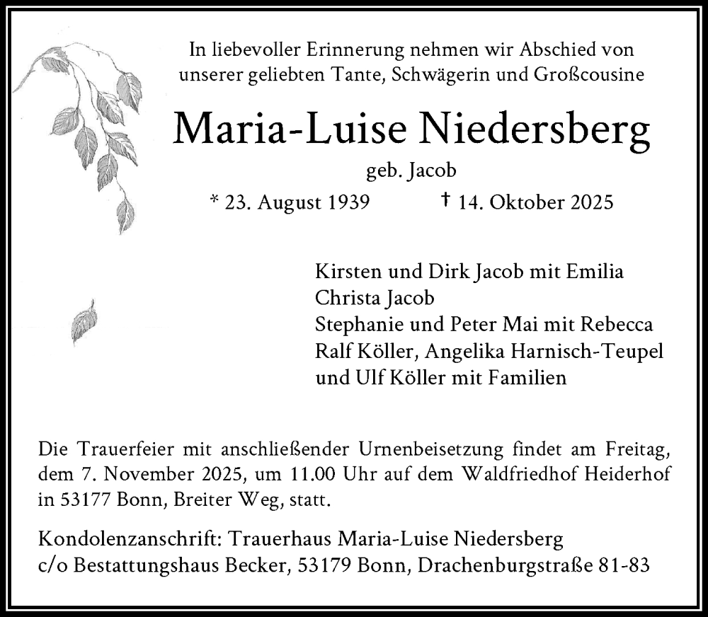 Hier finden Sie alle Traueranzeigen aus der Zeitung, die bisher für Maria-Luise Niedersberg erschienen sind. Weitere Traueranzeigen, die in der Zeitung erscheinen, werden hier ebenfalls aufgelistet