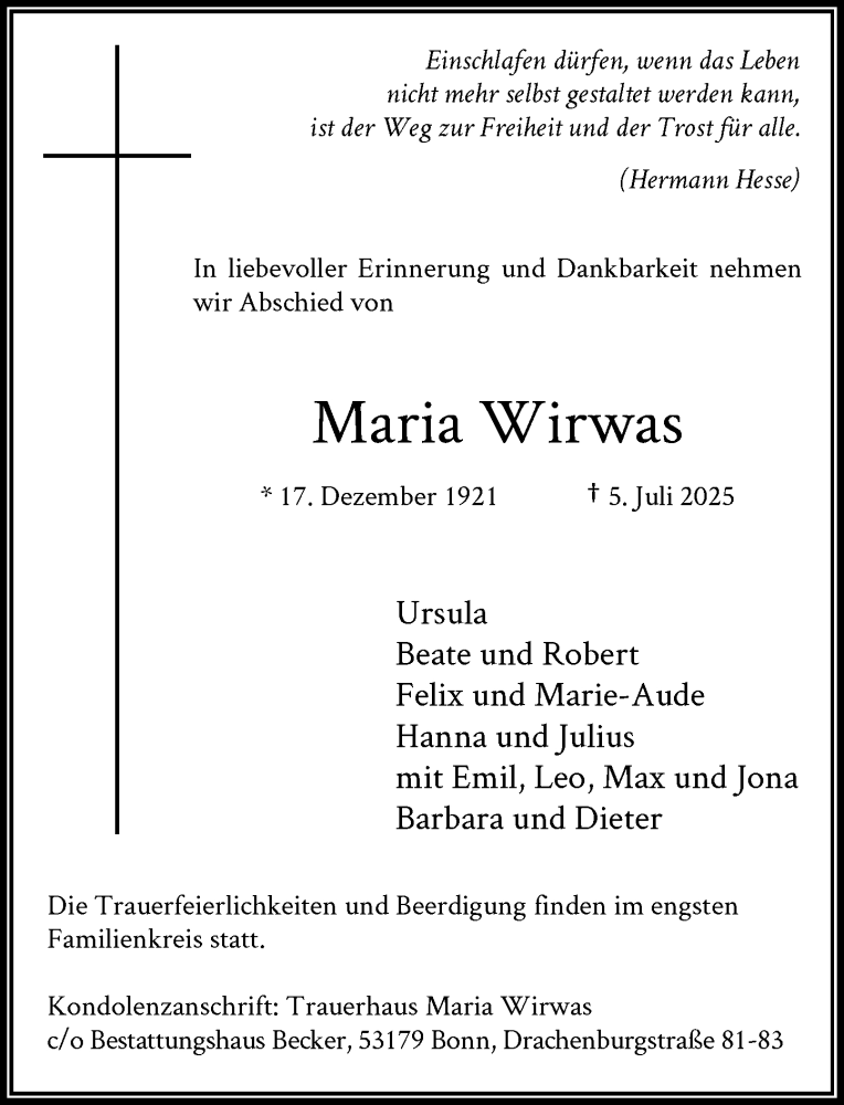 Hier finden Sie alle Traueranzeigen aus der Zeitung, die bisher für Maria Wirwas erschienen sind. Weitere Traueranzeigen, die in der Zeitung erscheinen, werden hier ebenfalls aufgelistet