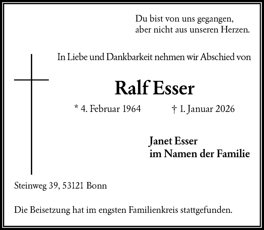 Hier finden Sie alle Traueranzeigen aus der Zeitung, die bisher für Ralf Esser erschienen sind. Weitere Traueranzeigen, die in der Zeitung erscheinen, werden hier ebenfalls aufgelistet
