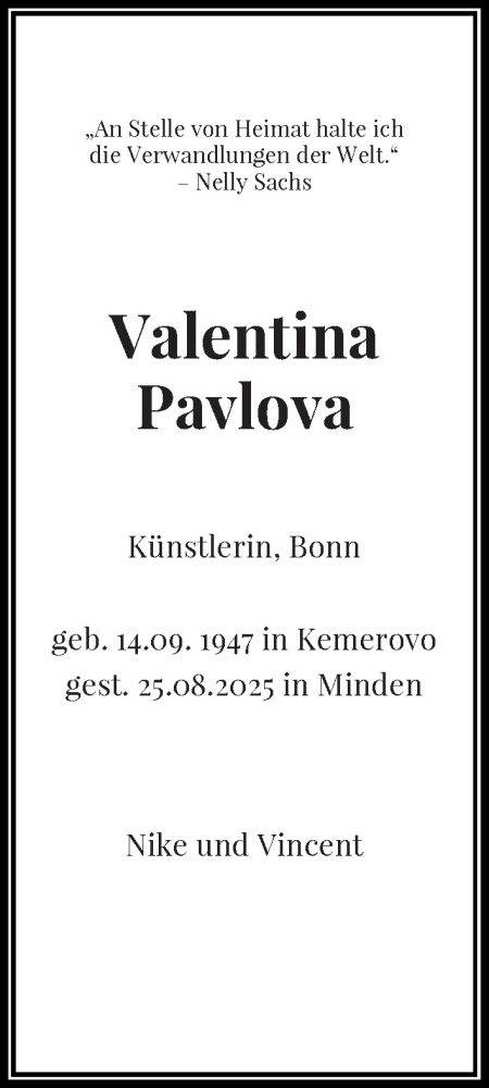 Hier finden Sie alle Traueranzeigen aus der Zeitung, die bisher für Valentina Pavlova erschienen sind. Weitere Traueranzeigen, die in der Zeitung erscheinen, werden hier ebenfalls aufgelistet