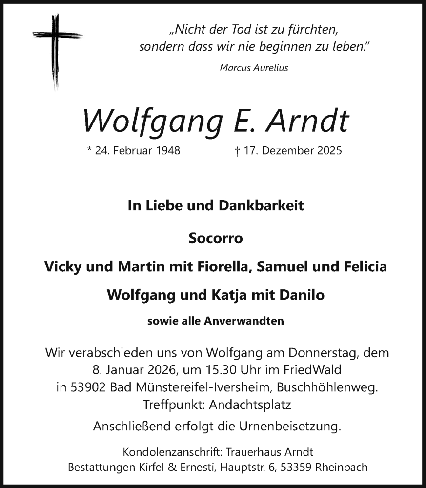 Hier finden Sie alle Traueranzeigen aus der Zeitung, die bisher für Wolfgang E. Arndt erschienen sind. Weitere Traueranzeigen, die in der Zeitung erscheinen, werden hier ebenfalls aufgelistet